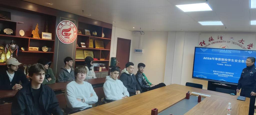 为切实保障寒假期间留校学生的人身与财产安全,引导学生度过一个平安、健康、快乐的假期,1 月 16 日,桂林理工大学国际教育学院联合桂林市公安局出入境管理支队共同举办 2026 年寒假留校学生安全教育活动,以 "平安留校・快乐过冬" 为主题,为留校学子送上全方位的安全防护指南。