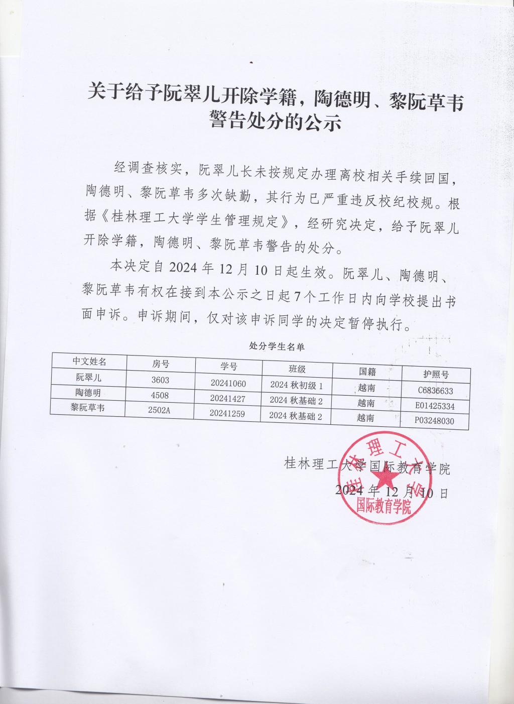 关于给予阮翠儿开除学籍,陶德明、黎阮草韦警告处分的公示